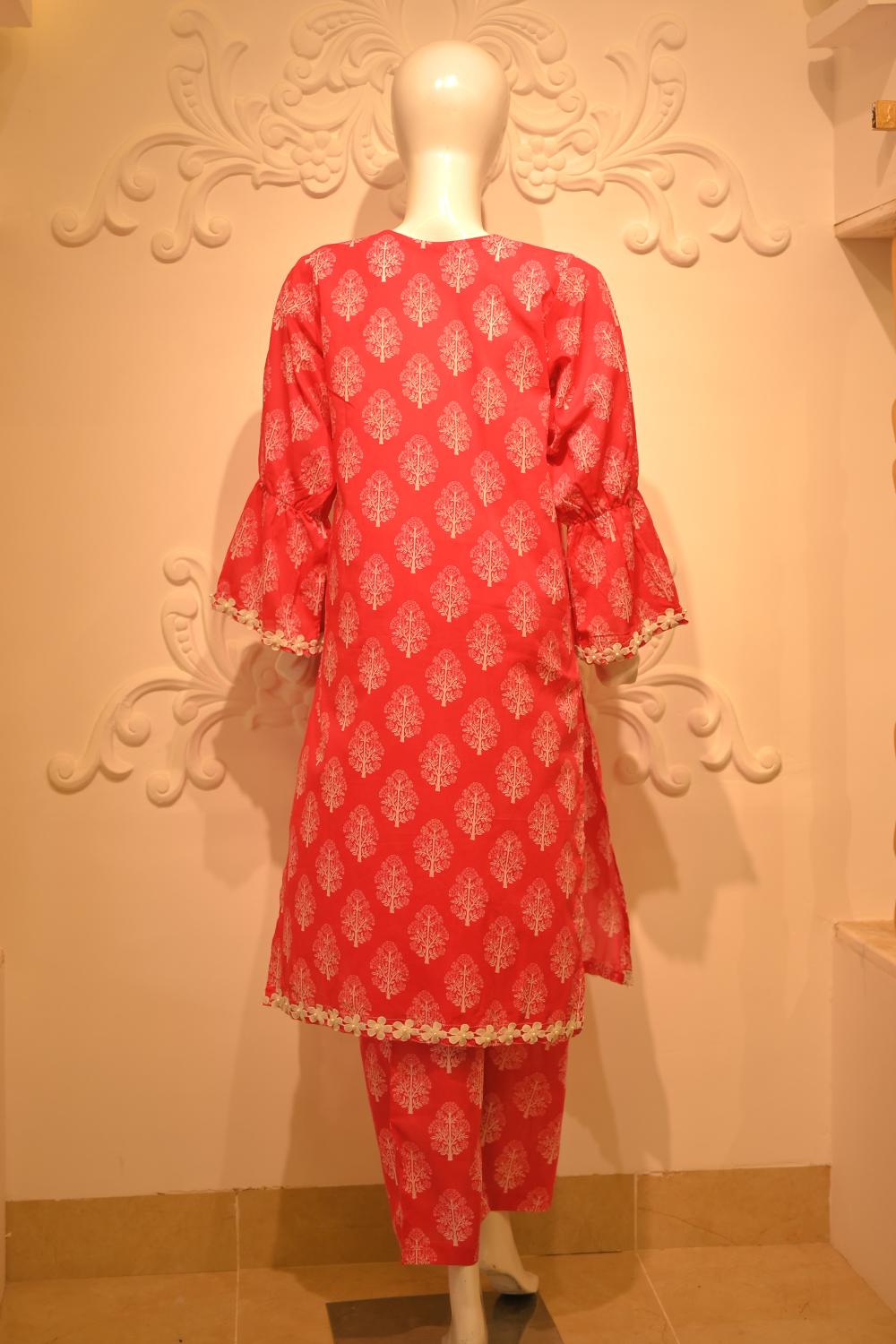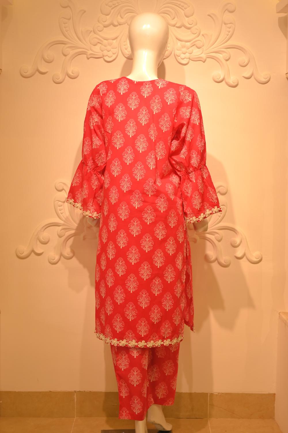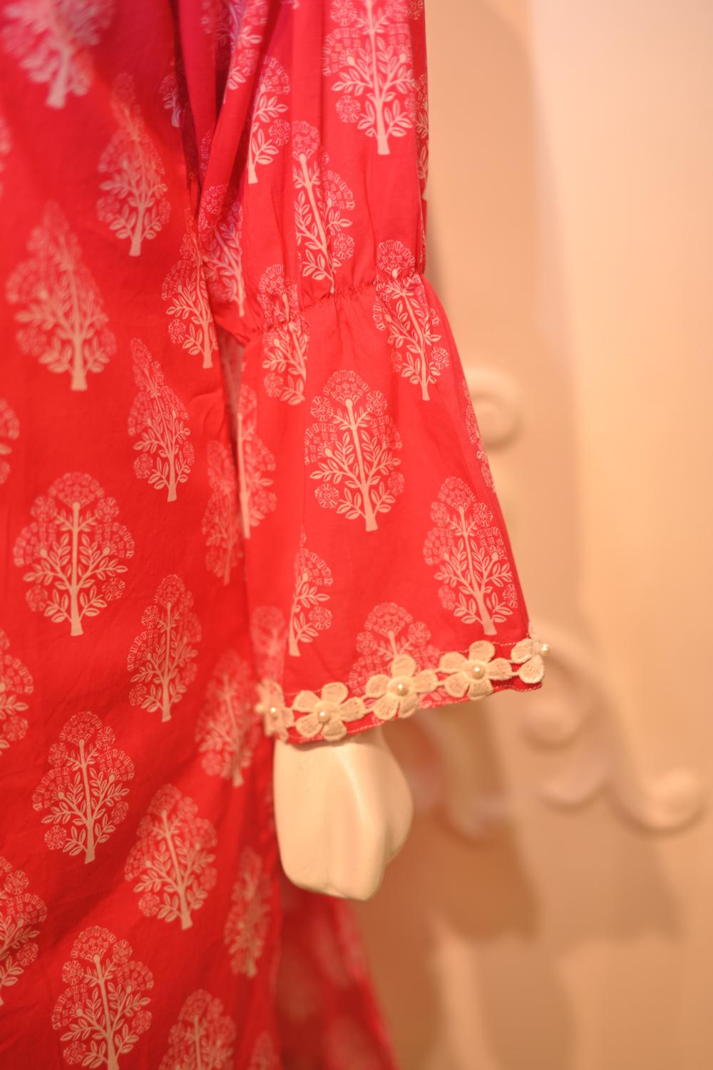 Stylish shirt in a deep crimson hue featuring a flattering V neckline with a soft fabric insert, enhanced by delicate lace trims and subtle tassel accents along the front for an effortlessly chic summer vibe. Sleeves are tastefully finished with fine lace detailing, adding a graceful touch without embroidery. Crafted in premium cotton lawn, this piece is breathable, lightweight, and perfect for warmer days with a polished, refined appeal.