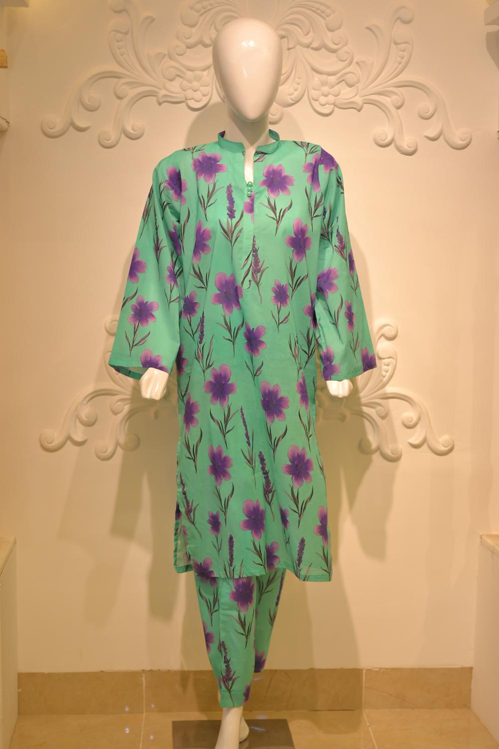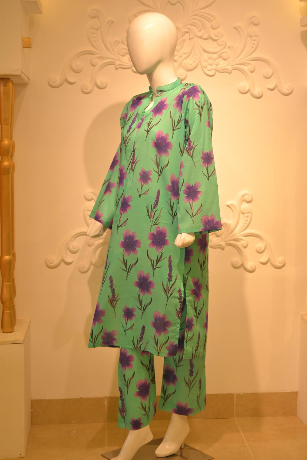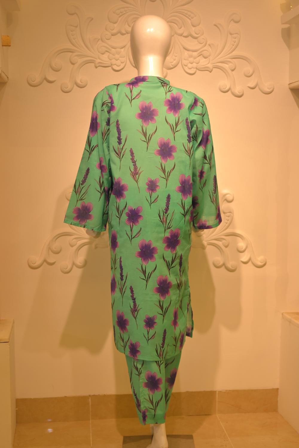 Breathe in the freshness of summer with this cotton lawn 2-piece set from Hazel Vogue’s seasonal edit. The shirt features a V neckline with soft fabric insert, adorned with lace detailing and subtle tassel accents for a refined finish. The standout element is its purple floral print, blooming across a botanical green canvas—a perfect harmony of nature and style.